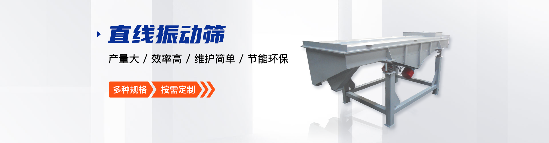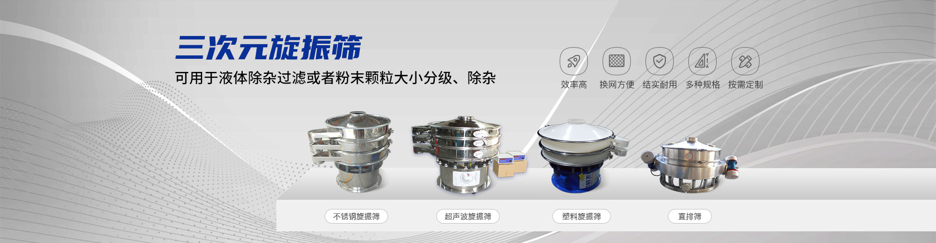 公司的主要產(chǎn)品有:三次元旋振篩、直線振動(dòng)篩、圓形搖擺篩、方形搖擺篩、脫水篩、超聲波振動(dòng)篩、塑料振動(dòng)篩、直排篩、高頻篩、450過(guò)濾篩、實(shí)驗(yàn)篩、斗式提升機(jī)、皮帶輸送機(jī)、過(guò)濾器、振動(dòng)電機(jī)等,